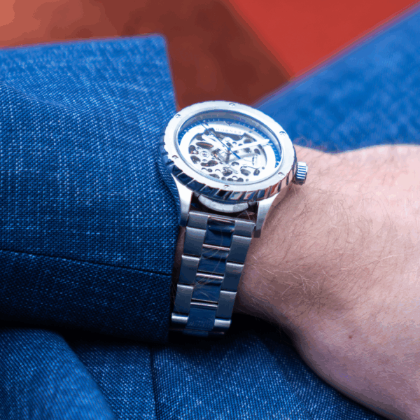 Die Hörner Pulsar Design Silber-Blau ist mehr als eine Uhr – sie ist ein mechanisches Statement am Handgelenk. Durch das skelettierte Zifferblatt offenbart sich das bewährte NH70-Automatikwerk, dessen Energie allein durch Bewegung entsteht. Der transparente Aufbau lässt jedes Zahnrad, jede Schwingung und jede Drehung sichtbar werden – ein Erlebnis, das digitale Uhren niemals bieten können.