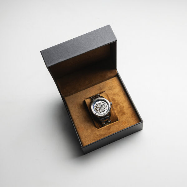 Mit ihrem Gewicht von 148 Gramm liegt sie angenehm schwer und wertig am Handgelenk. Das massive Gliederarmband mit Butterfly-Schließe sorgt für sicheren Halt und hohen Tragekomfort. Jede Uhr wird in einer edlen Hörner Geschenk- und Aufbewahrungsbox geliefert – perfekt zum Verschenken oder als Teil einer anspruchsvollen Uhrensammlung.