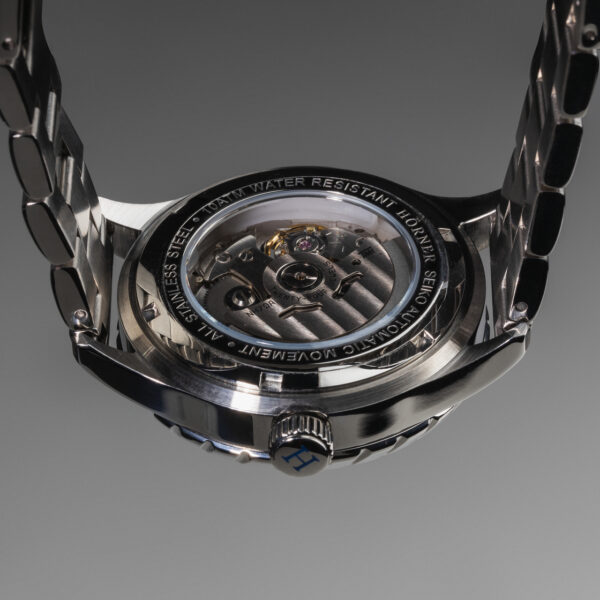 Das solide Edelstahlgehäuse mit satiniert-polierten Flächen betont den technischen Charakter der Uhr, während der silber-blaue Farbkontrast ihr eine klare, moderne Linie verleiht. Die Hörner Pulsar Design verkörpert die Philosophie der Marke: langlebige Mechanik, kompromisslose Verarbeitung und Design mit Substanz.