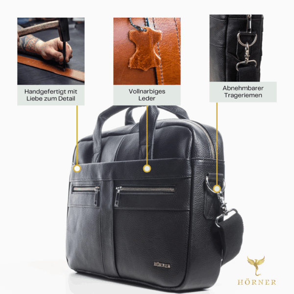 The Hörner Dresden model is a stylish and functional briefcase made from high-quality, treated cowhide leather in elegant black. With dimensions of 40 x 30 x 7 cm, this bag offers ample space for business essentials while remaining compact and easy to carry.