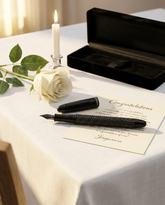 Die Oberfläche spricht in diesem Modell bewusst für sich. Eine Gravur ist hier nicht vorgesehen; das Carbon-Muster bleibt der eigentliche Charakter des Stifts. Wenn Sie die persönliche Note trotzdem setzen möchten, passt ein handgeschriebener Brief oder eine Karte mit Segensspruch dazu besonders gut.