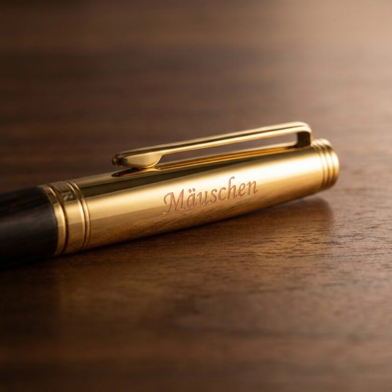 Bei der Bestellung geben Sie einfach Ihren Wunschtext ein: einen Namen, ein Datum oder eine kurze Widmung. Wir gravieren Ihren Text per Laser auf das Metall des Schreibgeräts — dauerhaft, präzise und in wenigen Werktagen versandfertig.