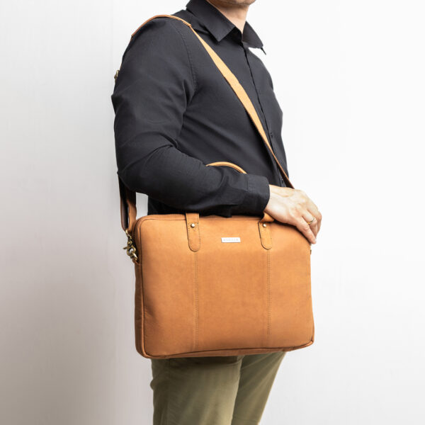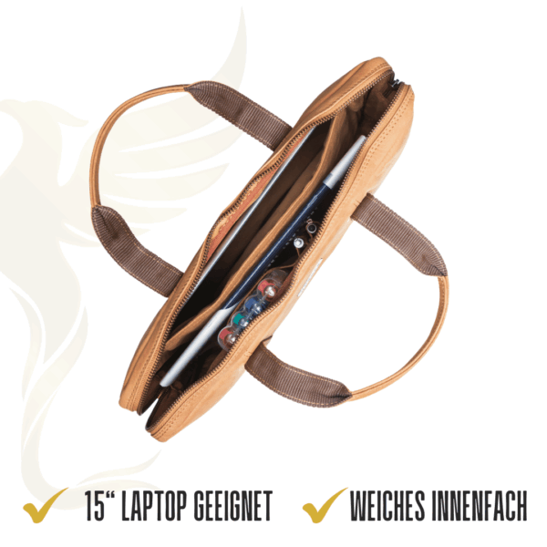 Mit einem Gewicht von nur 900 Gramm und den kompakten Maßen 38 × 28 × 6 cm bietet sie alles, was man im mobilen Arbeitsalltag benötigt. Ein leicht gepolstertes Fach schützt Geräte bis 15 Zoll, während ein großes Hauptfach, ein Reißverschlussinnenfach, zwei Stiftelaschen, drei Kartenfächer und ein kleines Zusatzfach für Ordnung sorgen.