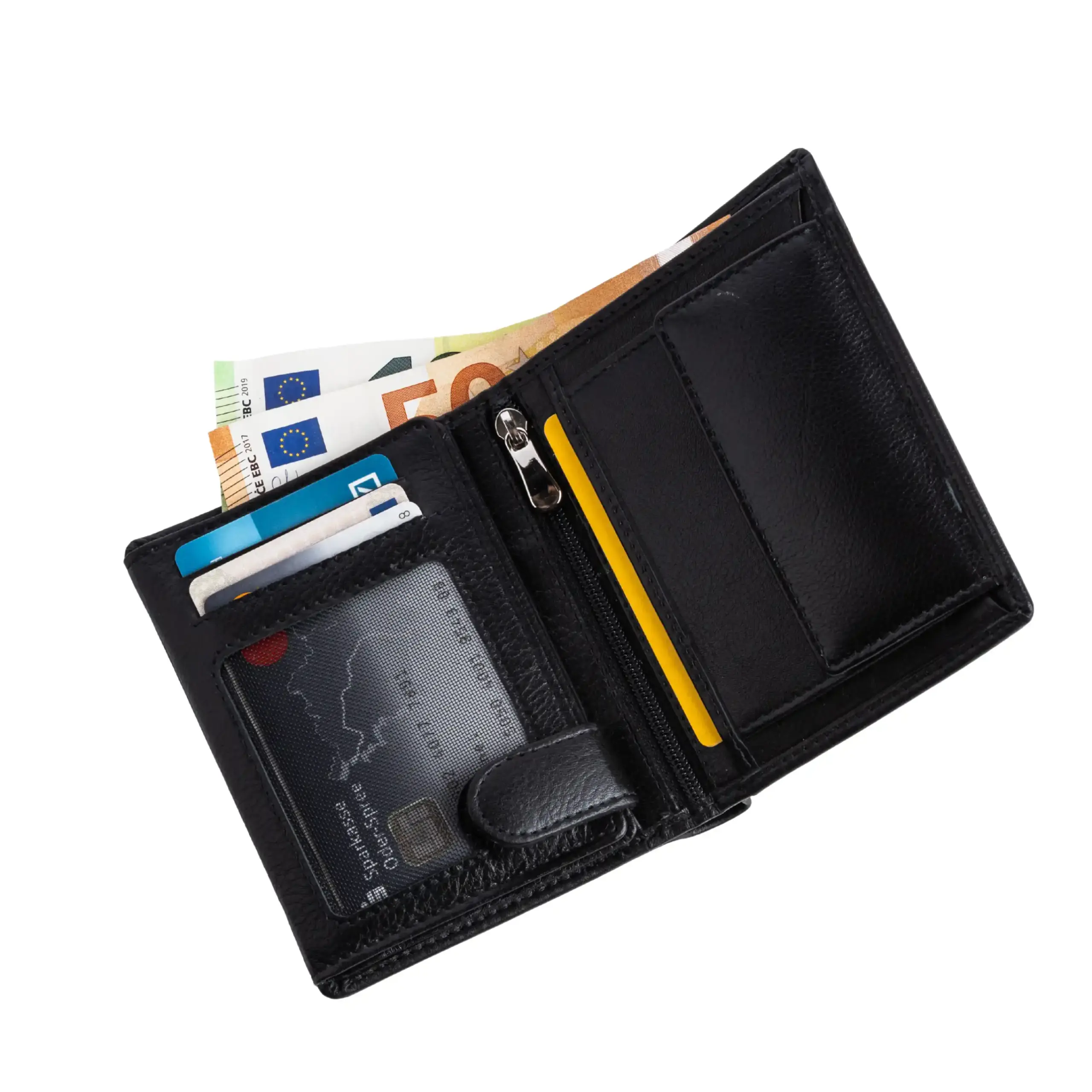 • Aufteilung: 10 Kartenfächer, davon 1 transparent, dazu 2 Scheinfächer, Druckknopf-Münzfach, 2 Ausweisfächer und 2 Geheimfächer für Reserven.