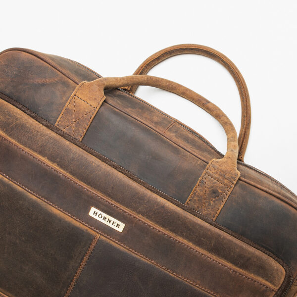 Die München Businesstasche von Hörner steht für markanten Stil und höchste Qualität. Gefertigt aus robustem, cognacfarbenem Echtleder mit natürlicher Patina, überzeugt sie durch ein maskulines Design, durchdachte Funktionalität und exzellente Verarbeitung.
