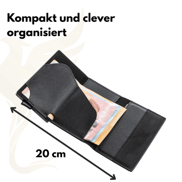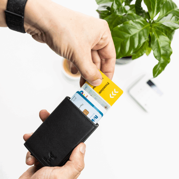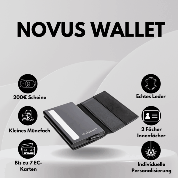 Für maximale Sicherheit ist der Novus mit einem integrierten RFID-Schutz ausgestattet, der Ihre Karten zuverlässig vor unbefugtem Auslesen bewahrt. Dank des praktischen Easy-Slide-Mechanismus haben Sie Ihre wichtigsten Karten blitzschnell griffbereit.
