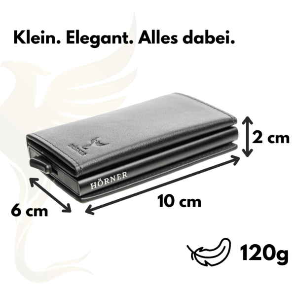 Der Hörner Novus ist die perfekte Kombination aus kompakter Größe und durchdachter Organisation. Mit seinen handlichen Maßen von 10 × 6 × 2 cm und einem Gewicht von nur 120 g passt er mühelos in jede Hosentasche, ohne Kompromisse bei Funktionalität oder Stil einzugehen.