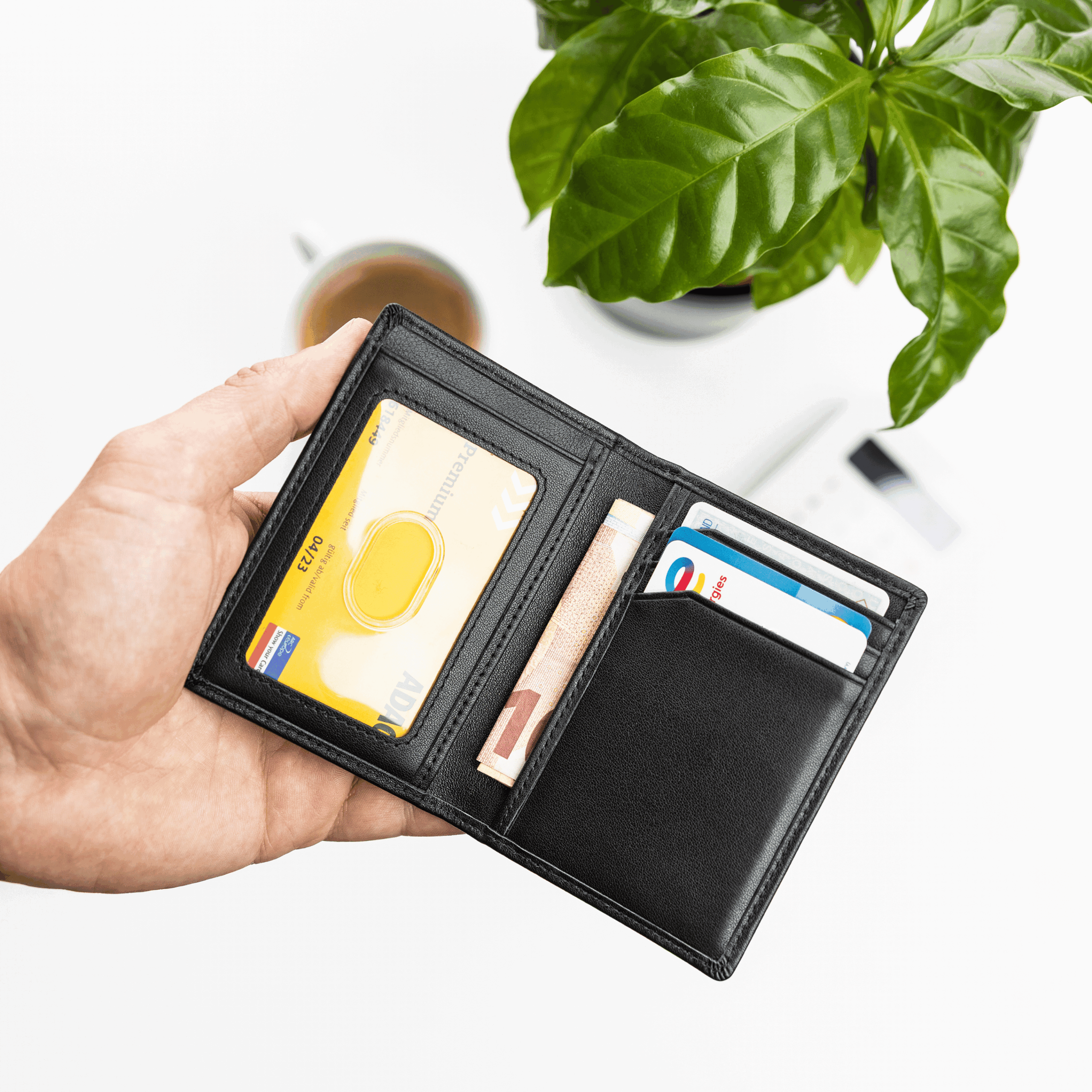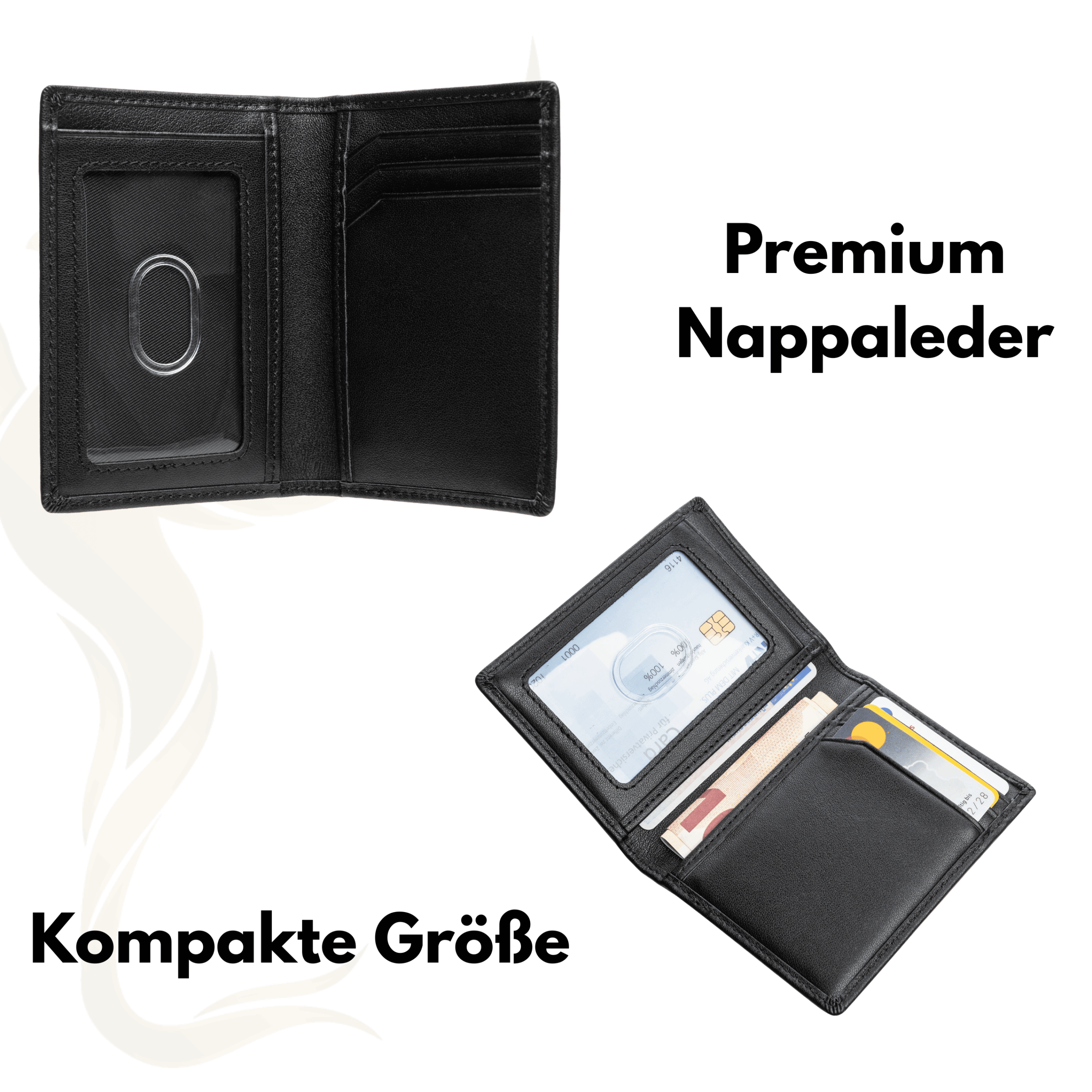 Seine handliche Größe macht ihn zum perfekten Alltagsbegleiter, ohne auf Funktionalität zu verzichten: 3 Kartenfächer innen, 2 Kartenfächer außen, 1 durchsichtiges Kartenfach für Ausweis oder Foto sowie 2 Innenfächer für Geldscheine, Quittungen oder zusätzliche Karten.
