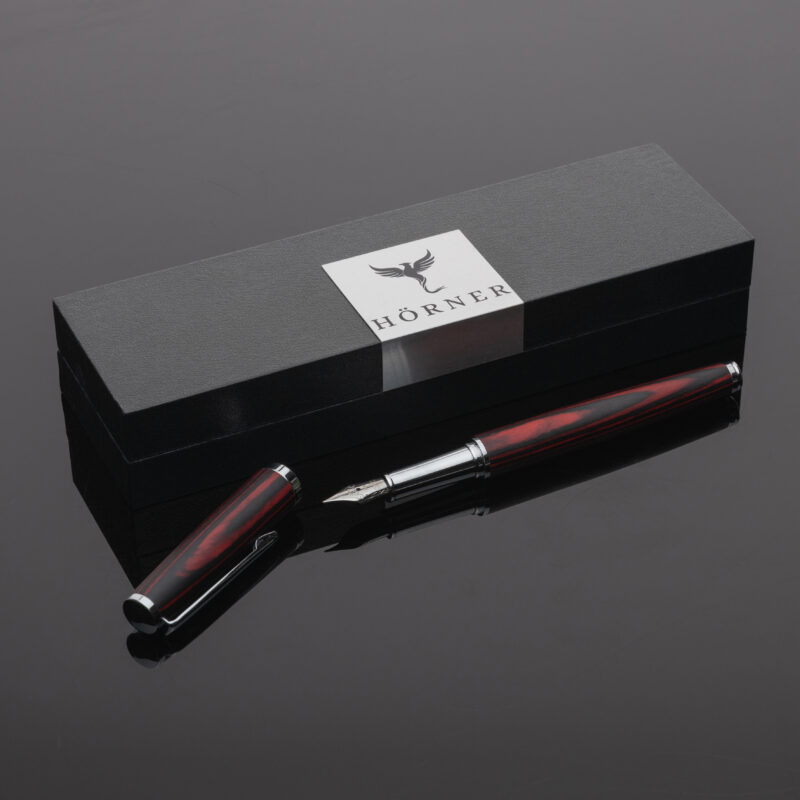 Die warmen Rottöne mit dynamischer Maserung setzen ein feuriges Statement. In Kombination mit verchromten Akzenten entsteht ein Stift, der auffällt — ohne Kompromisse bei der Schreibqualität.