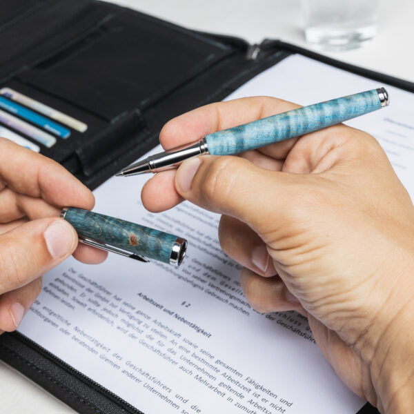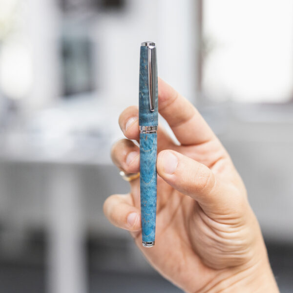 Der Primus Oceanus Tintenroller verbindet fließendes Schreiben mit dem Charme tiefer Blautöne. Die fein strukturierte Holzmaserung im Ozean-Look macht ihn zu einem echten Blickfang. Mit einem Gewicht von 28 g, 1,6 cm Durchmesser und einer Länge von 13,7 cm liegt der Rollerball komfortabel in der Hand – ideal für lange Schreibsessions und anspruchsvolle Schriftstücke. Präsentiert in einer edlen Geschenkbox.