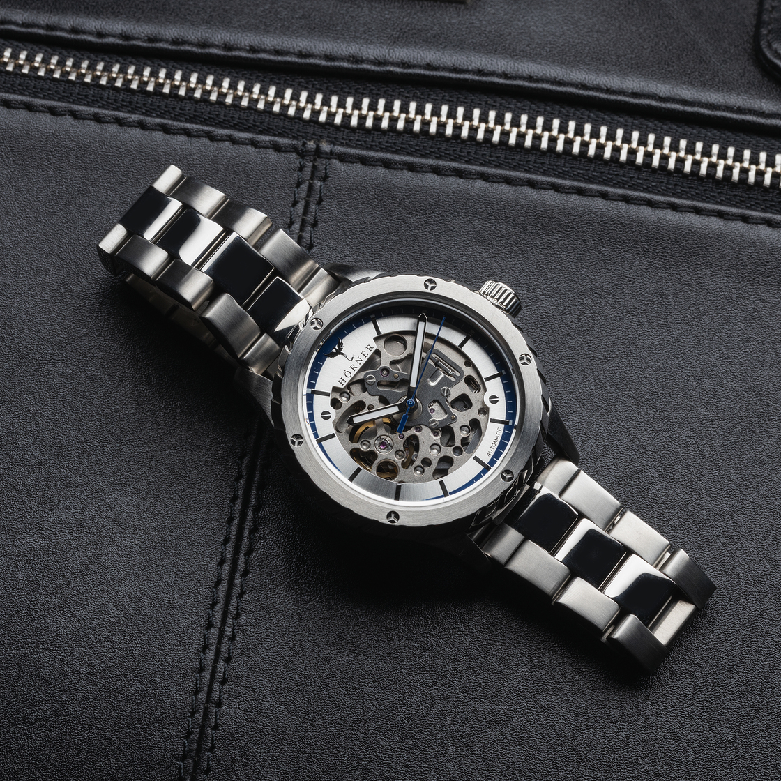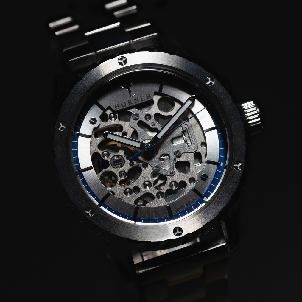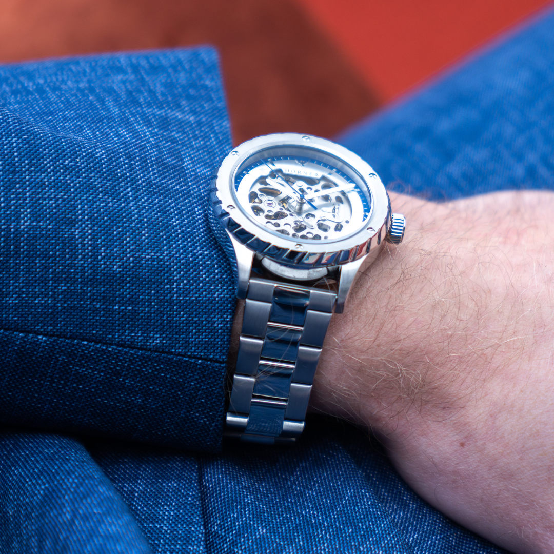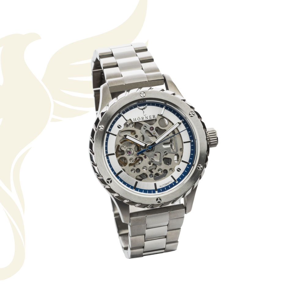 Das solide Edelstahlgehäuse mit satiniert-polierten Flächen betont den technischen Charakter der Uhr, während der silber-blaue Farbkontrast ihr eine klare, moderne Linie verleiht. Die Hörner Pulsar Design verkörpert die Philosophie der Marke: langlebige Mechanik, kompromisslose Verarbeitung und Design mit Substanz.