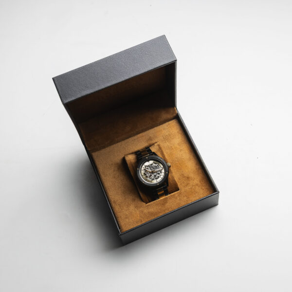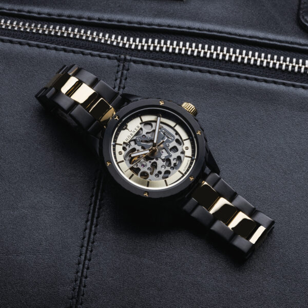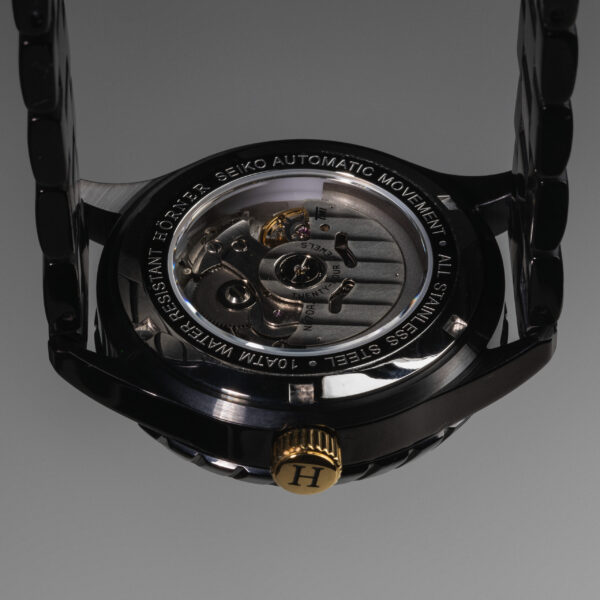 Die Hörner Pulsar Imperial Schwarz-Gold verkörpert das Zusammenspiel aus technischer Präzision und ästhetischer Dominanz. Das skelettierte NH70-Automatikwerk arbeitet sichtbar unter dem Zifferblatt – ein faszinierendes Schauspiel aus Zahnrädern und Bewegung, das für die Handwerkskunst steht, die jede Hörner Uhr auszeichnet.