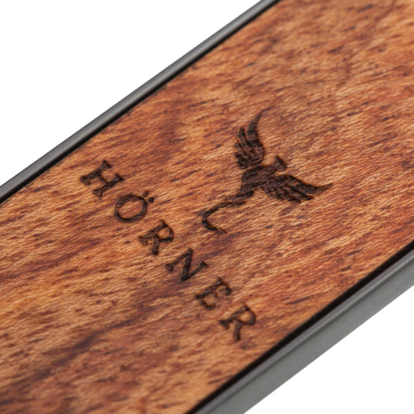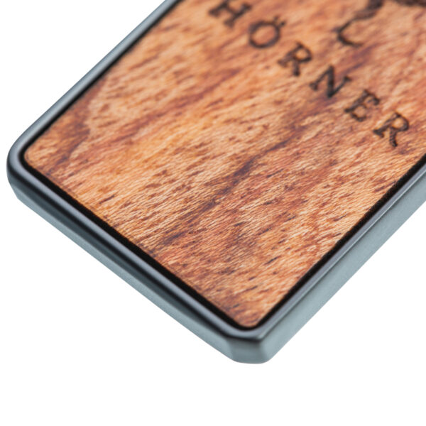 Auf der Vorderseite ist das Hörner-Logo dezent in das Holz graviert und verleiht dem Anhänger eine exklusive Note. Die Rückseite bietet eine vollständig gravierbare Fläche, die sich individuell mit Initialen, Logos oder persönlichen Botschaften gestalten lässt – perfekt, um den Regulus zu einem einzigartigen Begleiter zu machen.